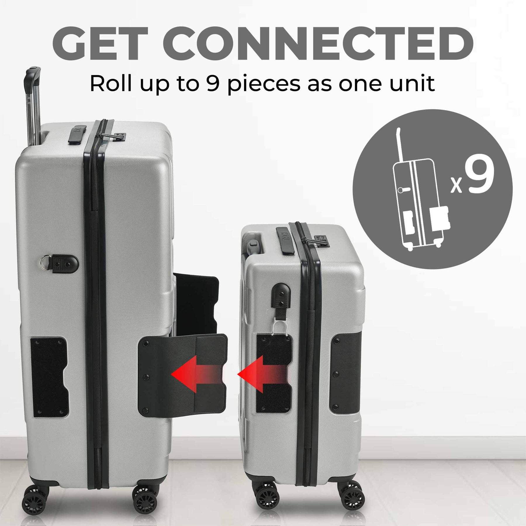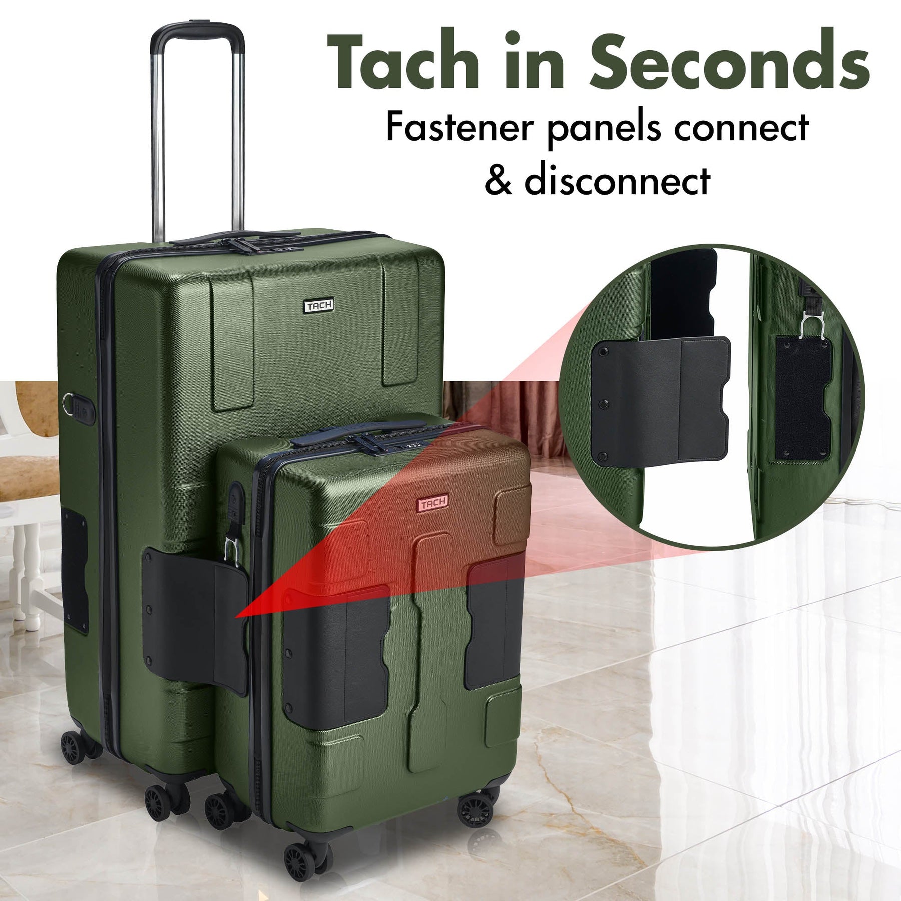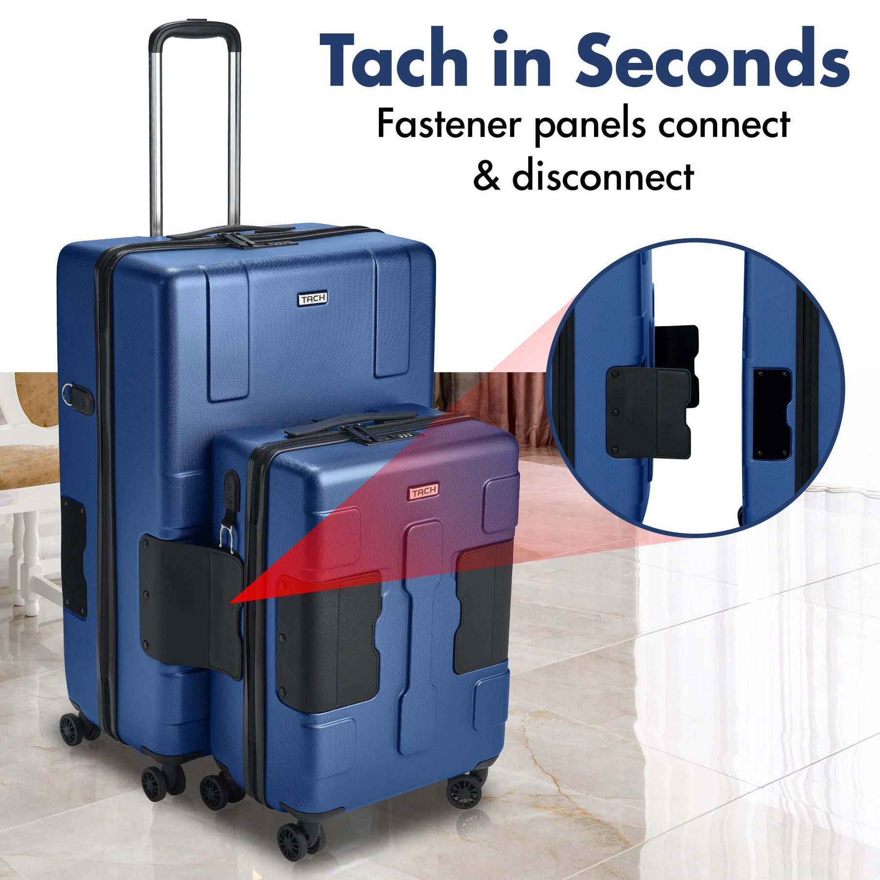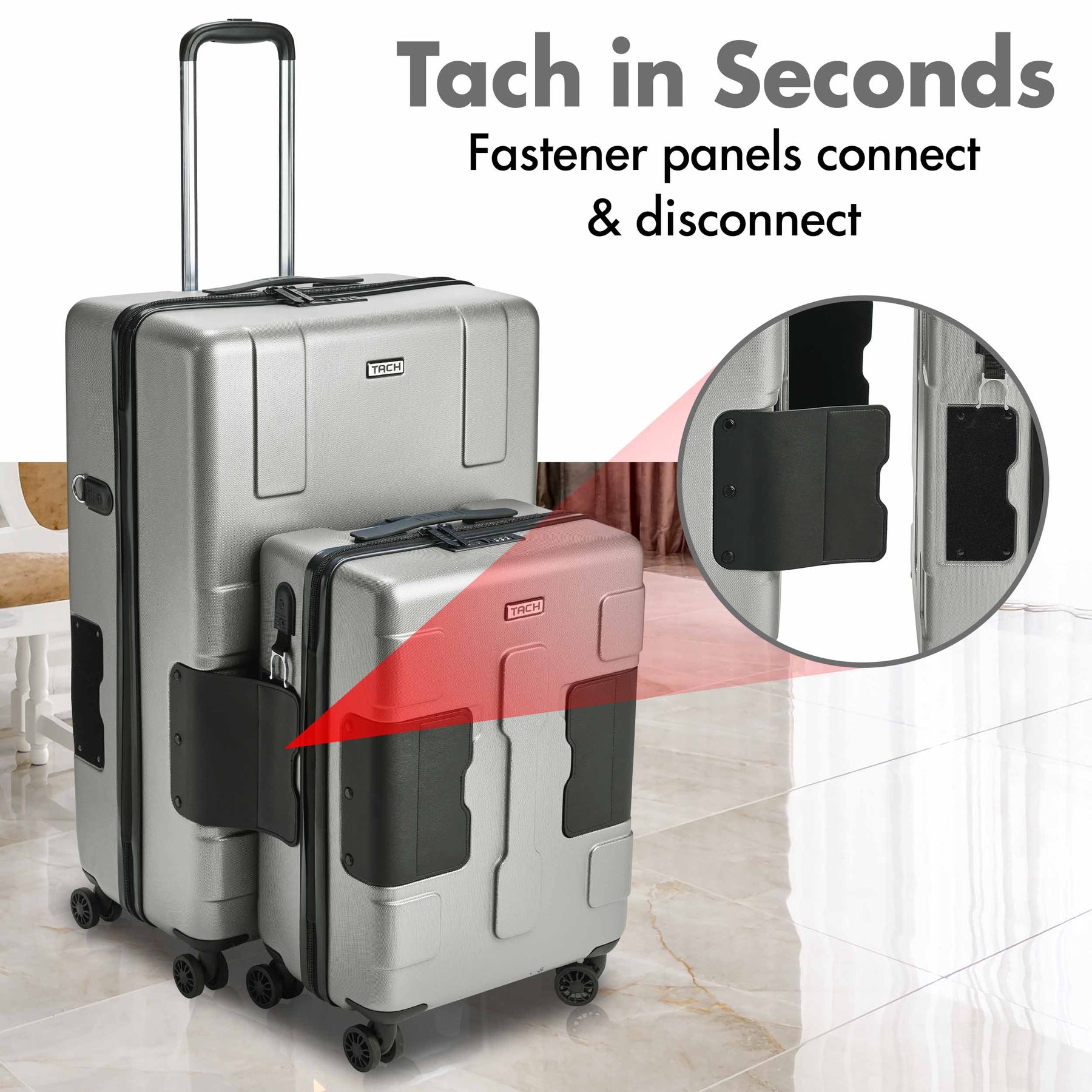 The patented TACH connection system is the most practical advancement in travel since the invention of wheeled luggage. It enables one person to handle multiple bags without a trolley or porter. The flat top design holds laptops and backpacks. Ideal for holiday or global travel.