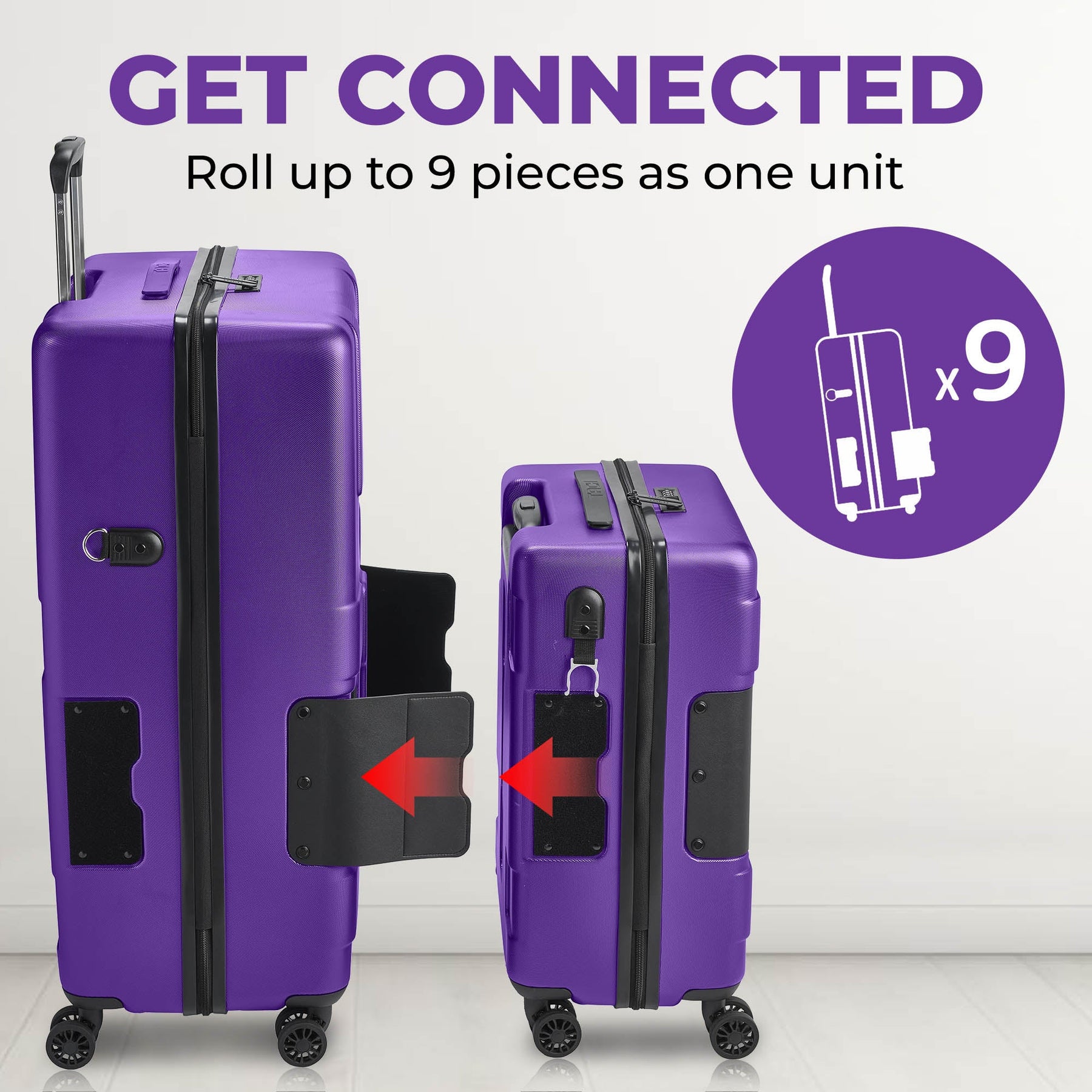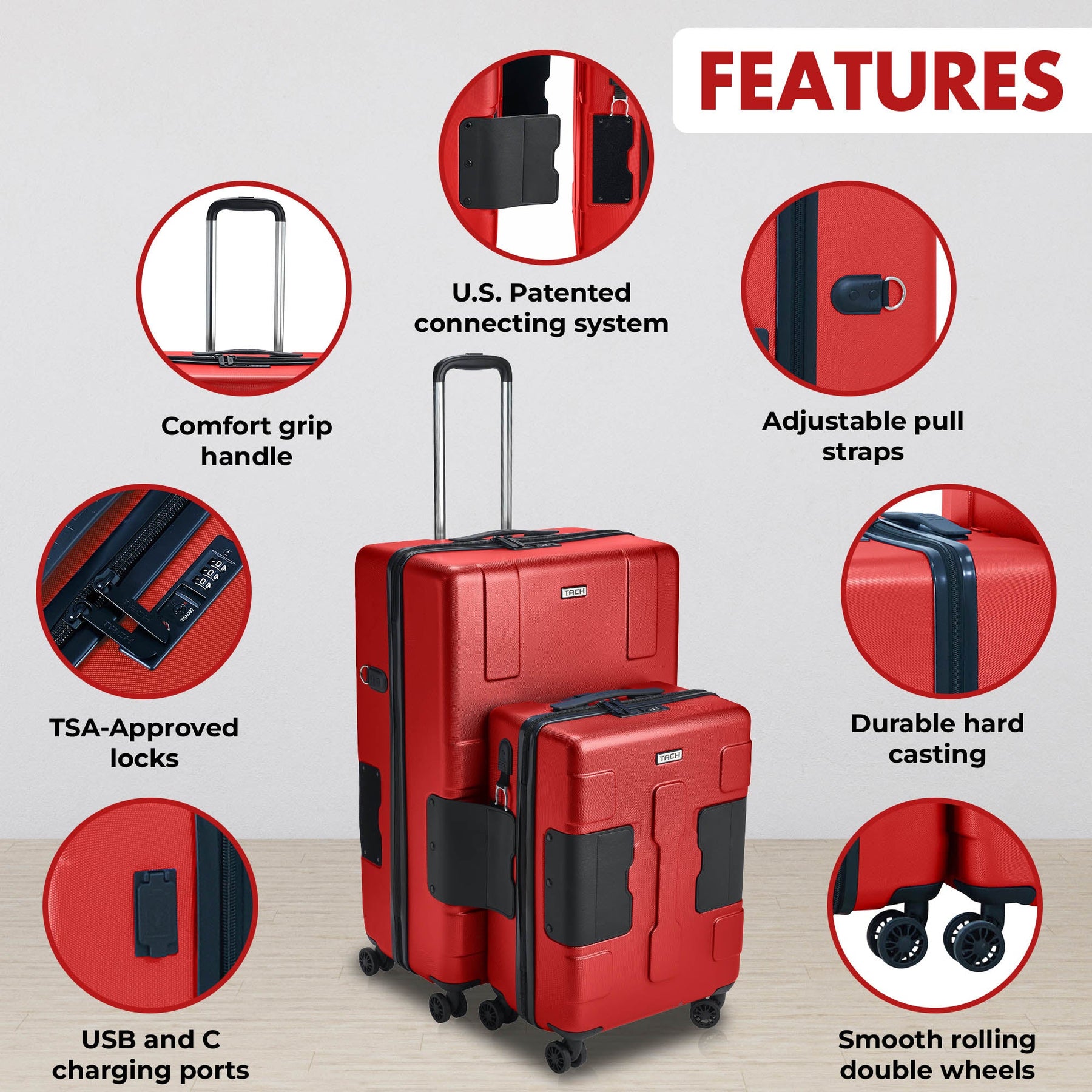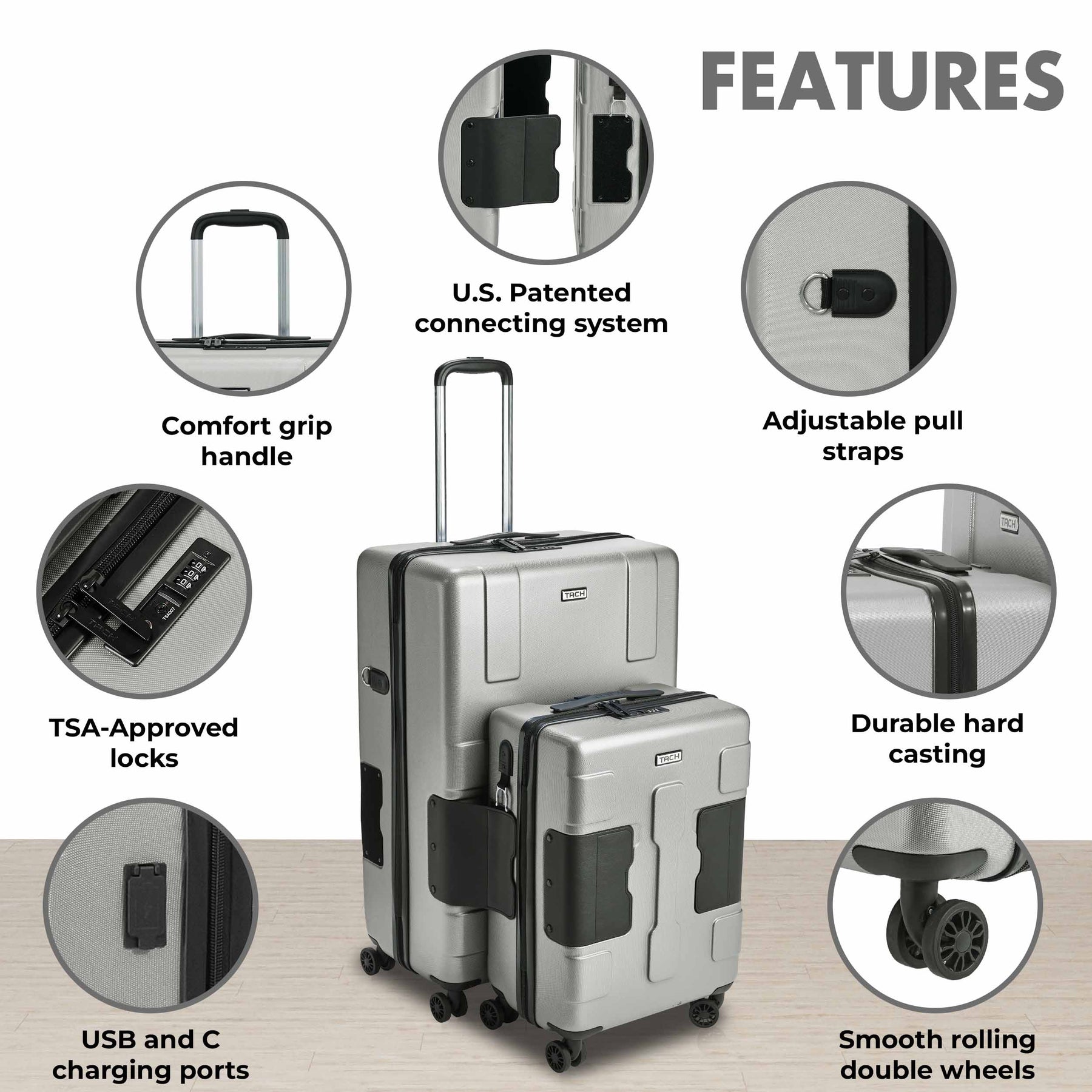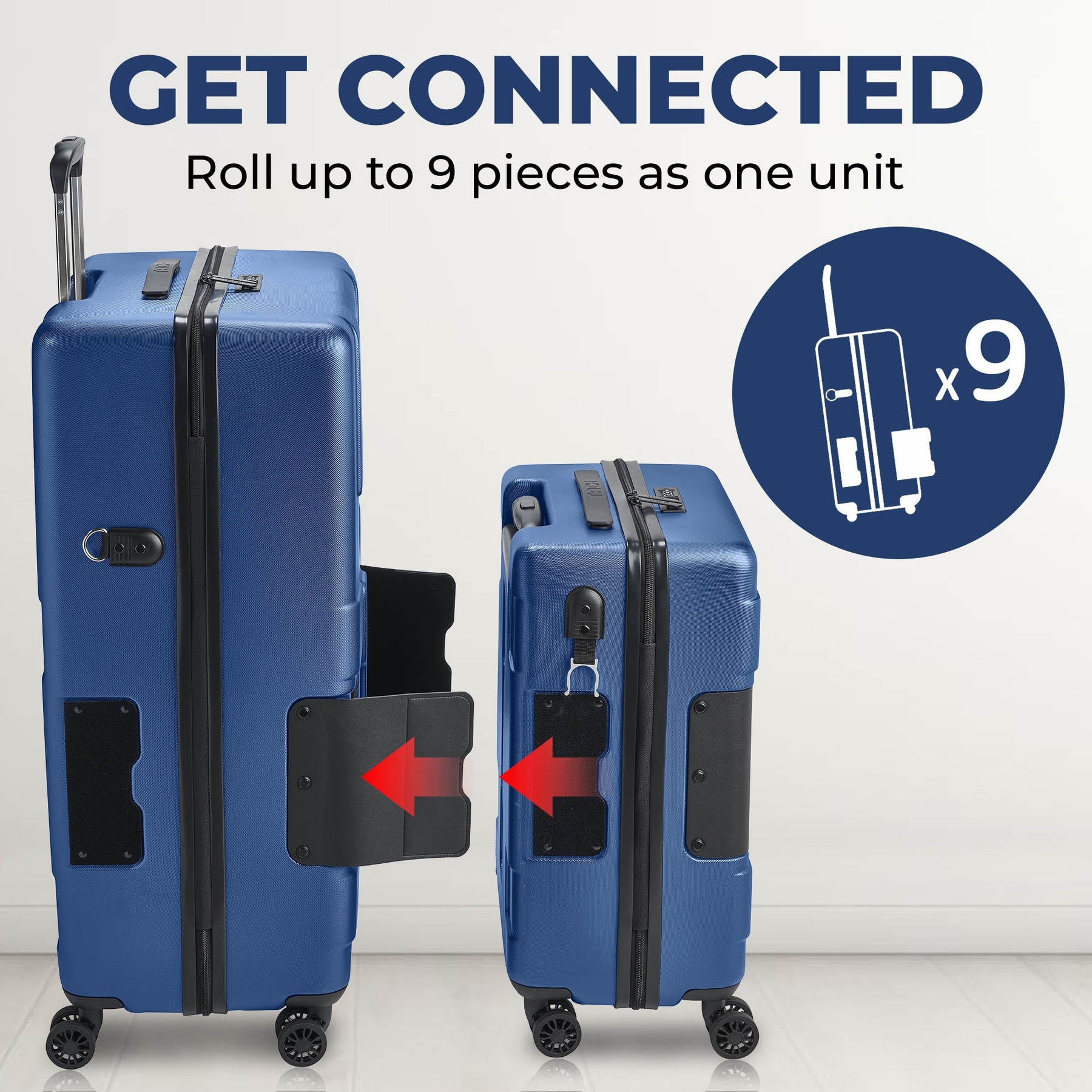 The patented TACH connection system is the most practical advancement in travel since the invention of wheeled luggage. It enables one person to handle multiple bags without a trolley or porter. The flat top design holds laptops and backpacks. Ideal for holiday or global travel.